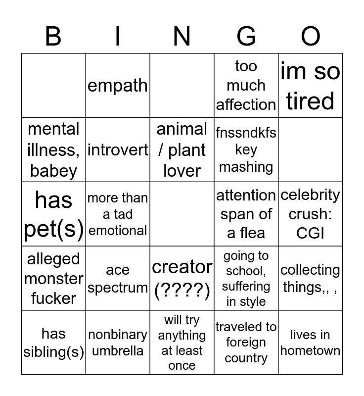 This bingo card has a free space and 21 words: ace spectrum, nonbinary umbrella, animal / plant lover, has sibling(s), im so tired, mental illness, babey, empath, attention span of a flea, creator (????), fnssndkfs key mashing, has pet(s), going to school, suffering in style, collecting things,, ,, introvert, traveled to foreign country, celebrity crush: CGI, more than a tad emotional, lives in hometown, alleged monster fucker, too much affection and will try anything at least once.