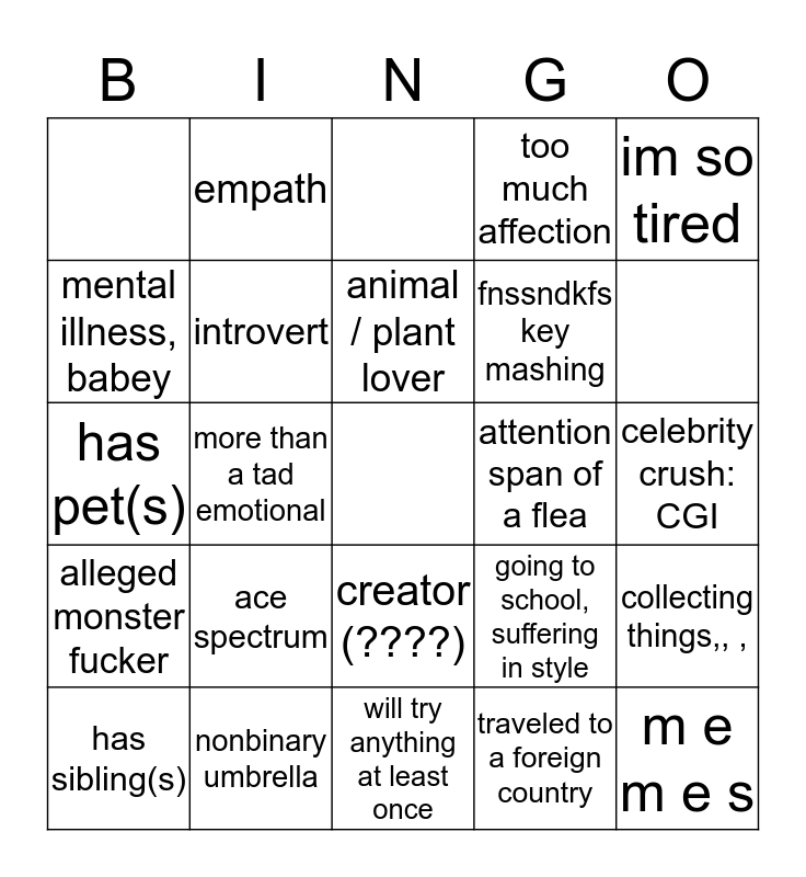 This bingo card has a free space and 21 words: ace spectrum, nonbinary umbrella, animal / plant lover, has sibling(s), im so tired, mental illness, babey, empath, attention span of a flea, creator (????), fnssndkfs key mashing, has pet(s), going to school, suffering in style, collecting things,, ,, introvert, traveled to a foreign country, celebrity crush: CGI, more than a tad emotional, m e m e s, alleged monster fucker, too much affection and will try anything at least once.