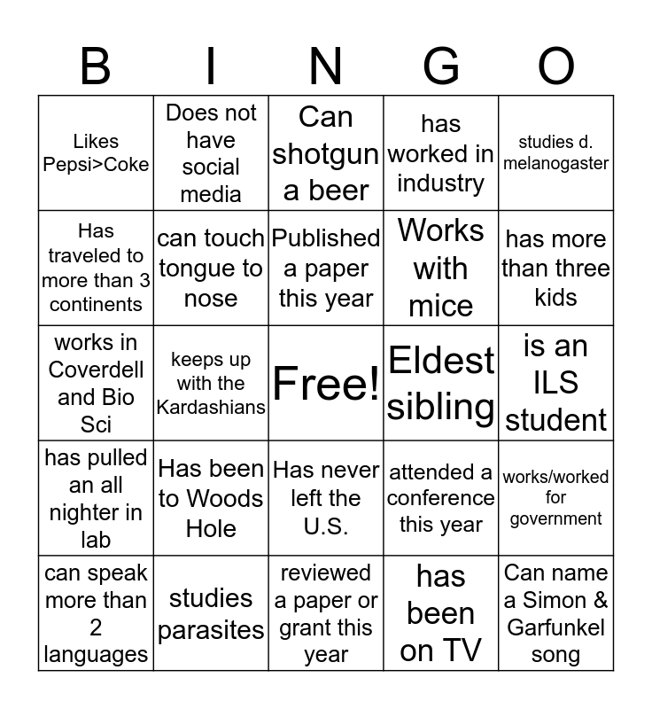 This bingo card has a free space and 24 words: Has been to Woods Hole, studies parasites, Published a paper this year, can speak more than 2 languages, studies d. melanogaster, Likes Pepsi>Coke, Has traveled to more than 3 continents, Does not have social media, Eldest sibling, Has never left the U.S., Works with mice, works in Coverdell and Bio Sci, attended a conference this year, works/worked for government, can touch tongue to nose, has been on TV, is an ILS student, Can shotgun a beer, has more than three kids, keeps up with the Kardashians, Can name a Simon & Garfunkel song, has pulled an all nighter in lab, has worked in industry and reviewed a paper or grant this year.