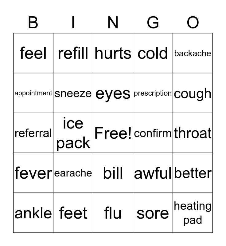 This bingo card has a free space and 24 words: earache, feet, eyes, ankle, backache, feel, appointment, refill, confirm, bill, prescription, referral, awful, better, sneeze, sore, throat, hurts, cough, ice pack, heating pad, fever, cold and flu.