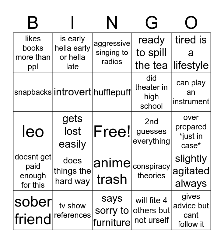 This bingo card has a free space and 24 words: does things the hard way, tv show references, hufflepuff, sober friend, tired is a lifestyle, likes books more than ppl, snapbacks, is early hella early or hella late, 2nd guesses everything, anime trash, did theater in high school, leo, conspiracy theories, slightly agitated always, introvert, will fite 4 others but not urself, over prepared *just in case*, aggressive singing to radios, can play an instrument, gets lost easily, gives advice but cant follow it, doesnt get paid enough for this, ready to spill the tea and says sorry to furniture.