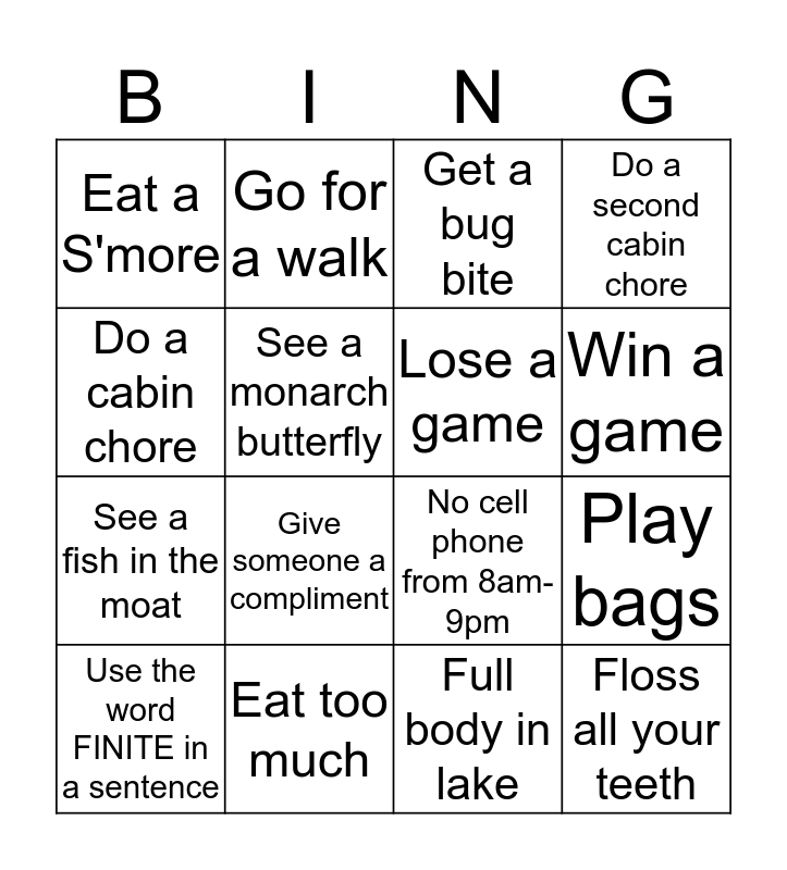 This bingo card has 16 words: Eat too much, Play bags, Get a bug bite, Eat a S'more, See a fish in the moat, Go for a walk, No cell phone from 8am-9pm, Full body in lake, Do a cabin chore, See a monarch butterfly, Use the word FINITE in a sentence, Do a second cabin chore, Give someone a compliment, Win a game, Lose a game and Floss all your teeth.