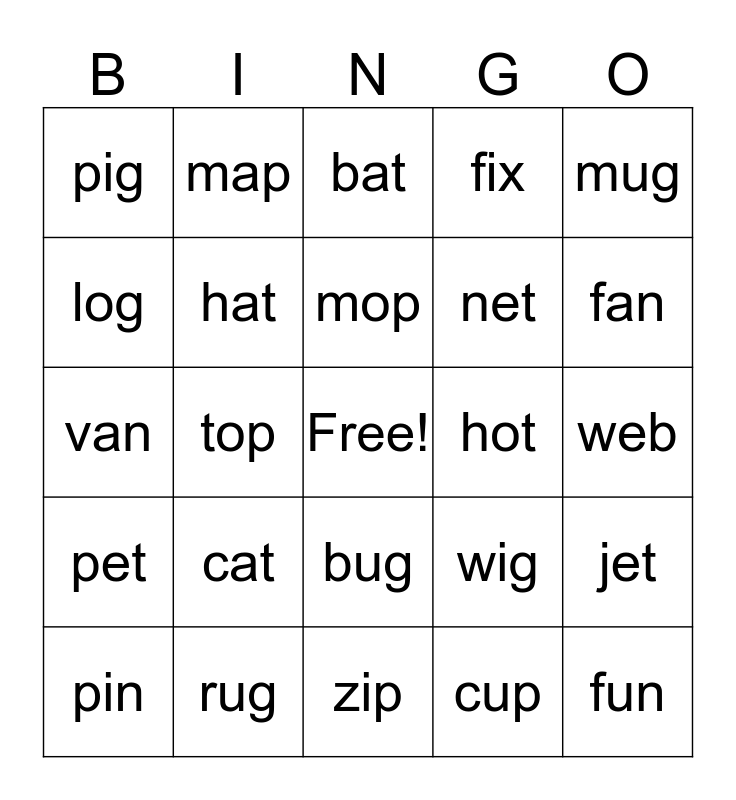This bingo card has a free space and 24 words: cat, rug, mop, pin, mug, pig, log, map, hot, bug, net, van, wig, jet, hat, cup, web, bat, fan, top, fun, pet, fix and zip.
