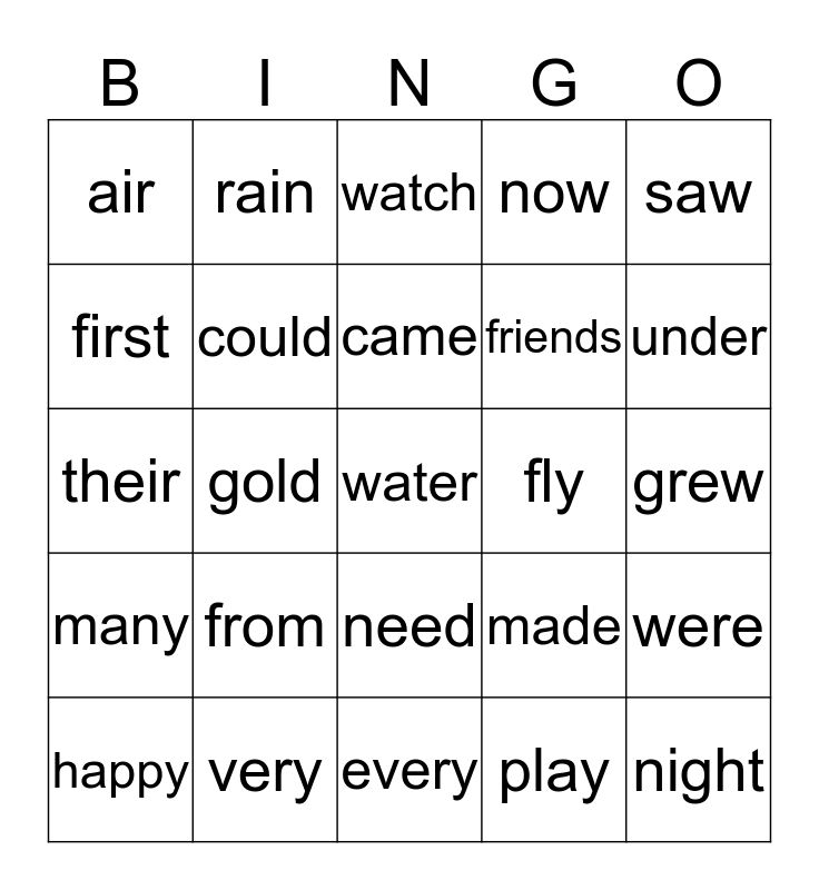 This bingo card has a free space and 24 words: from, very, came, happy, saw, air, first, rain, fly, need, friends, their, made, were, could, play, grew, watch, under, gold, night, many, now and every.