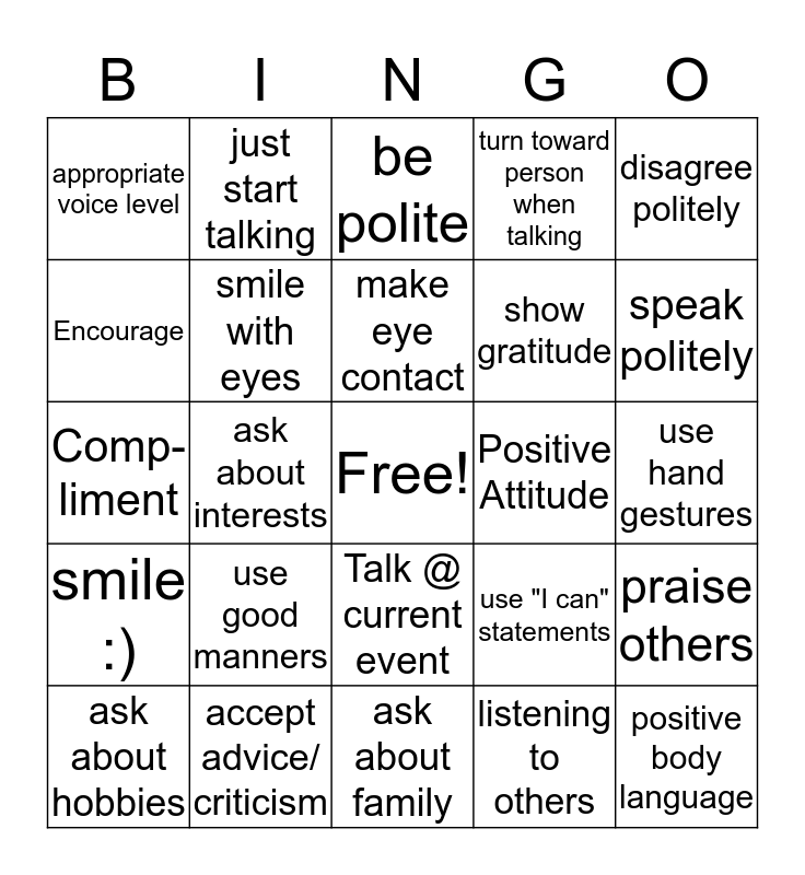 This bingo card has a free space and 24 words: use good manners, accept advice/ criticism, make eye contact, ask about hobbies, disagree politely, appropriate voice level, Encourage, just start talking, Positive Attitude, Talk @ current event, show gratitude, Comp-liment, use "I can" statements, praise others, smile with eyes, listening to others, use hand gestures, be polite, speak politely, ask about interests, positive body language, smile :), turn toward person when talking and ask about family.