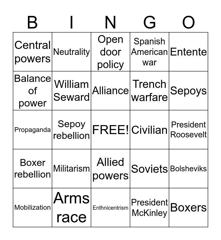 This bingo card has a free space and 24 words: Militarism, Arms race, Alliance, Mobilization, Entente, Central powers, Balance of power, Neutrality, Civilian, Allied powers, Trench warfare, Propaganda, Soviets, Bolsheviks, William Seward, President McKinley, President Roosevelt, Open door policy, Sepoys, Sepoy rebellion, Boxers, Boxer rebellion, Spanish American war and Enthnicentrism.