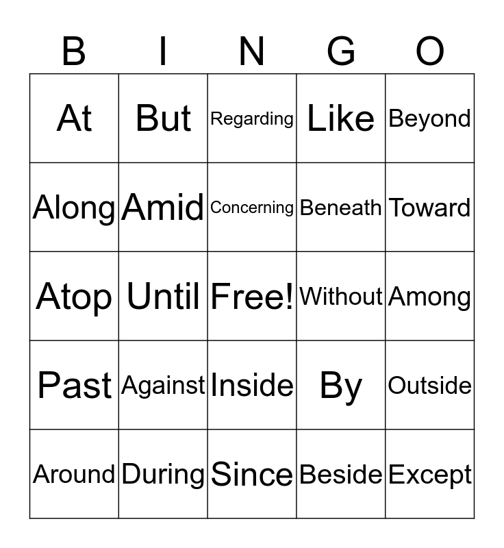 This bingo card has a free space and 24 words: Against, During, Concerning, Around, Beyond, At, Along, But, Without, Inside, Beneath, Atop, By, Outside, Amid, Beside, Among, Regarding, Toward, Until, Except, Past, Like and Since.