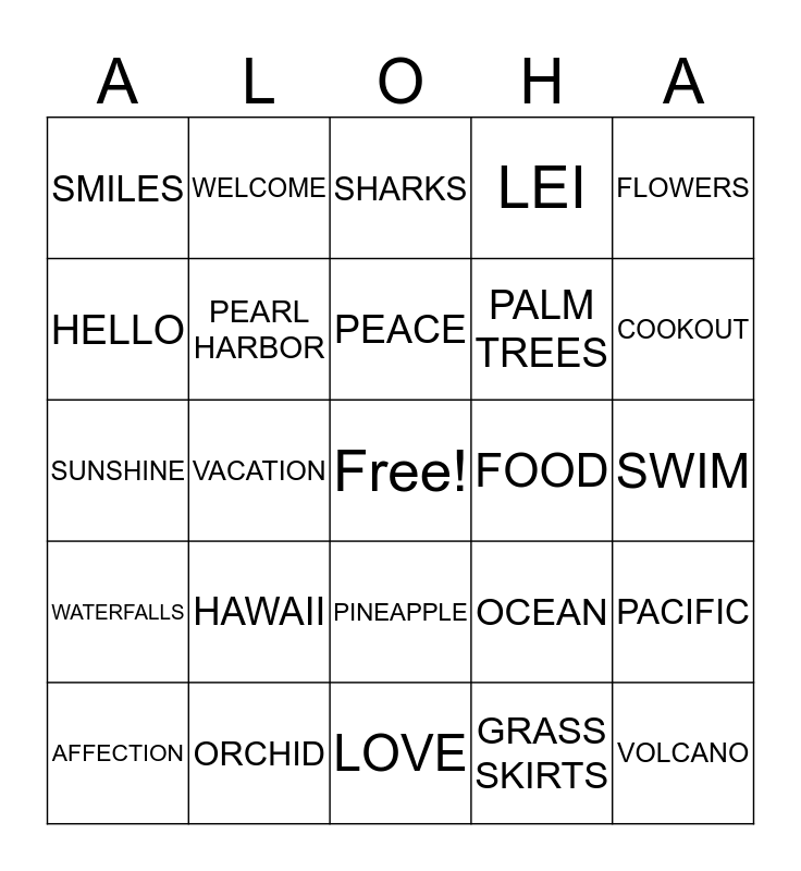 This bingo card has a free space and 25 words: HAWAII, LOVE, PEACE, AFFECTION, FLOWERS, SMILES, HELLO, WELCOME, FOOD, PINEAPPLE, PALM TREES, SUNSHINE, OCEAN, PACIFIC, PEARL HARBOR, SURFER, SWIM, SHARKS, COOKOUT, VACATION, VOLCANO, ORCHID, WATERFALLS, LEI and GRASS SKIRTS.