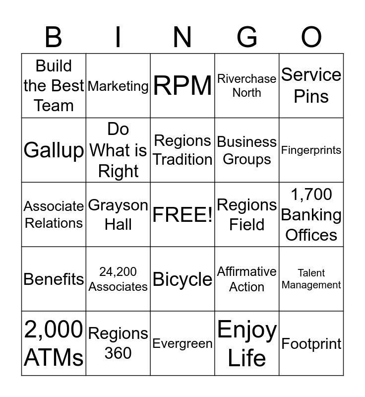 This bingo card has a free space and 41 words: South Region, Associate Relations, Regions Center, Do What is Right, Regions 360, Bicycle, Regions Tradition, Human Resources, Service Pins, Benefits, Grayson Hall, Riverchase North, Footprint, 1,700 Banking Offices, Regions Field, 24,200 Associates, Training, Build the Best Team, Founded in 1856, RPM, Talent Management, Payroll, Evergreen, Business Groups, Put People First, Focus on the Customer, Enjoy Life, Reach Higher, Fingerprints, Associate Engagement, Dave Keenan, Marketing, 2,000 ATMs, Diversity, Affirmative Action, Gallup, Strengths Finder, Legal, Officers Meeting, Share the Good and What a difference a day makes.