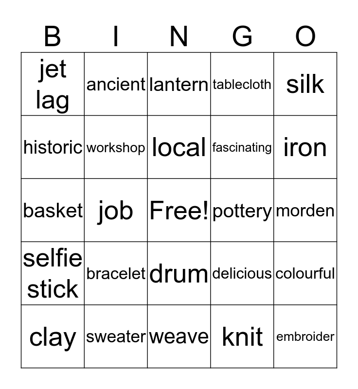 This bingo card has a free space and 44 words: artisan, embroider, conical hat, clay, eggshell, knit, lantern, scarf, silk, sweater, tablecloth, pottery, drum, bracelet, wood, weave, cast, basket, gold, iron, ancient, affordable, easy going, jet lag, polluted, morden, fabulous, comfortable, delicious, selfie stick, crowed, colourful, urban, countryside, job, retire, retirement, reliable, local, historic, fascinating, helpful, workshop and mould.