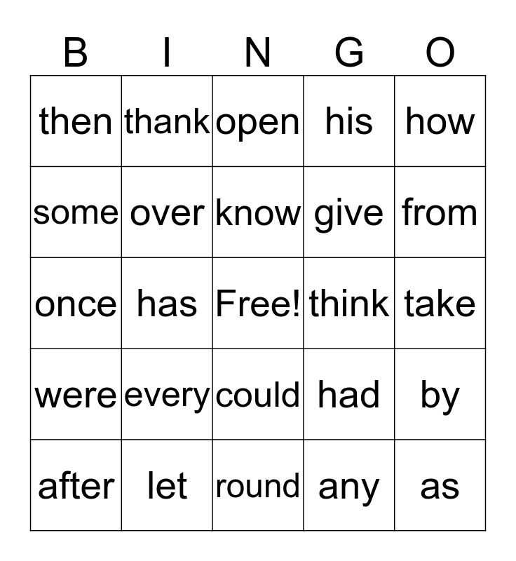 This bingo card has a free space and 24 words: every, let, know, after, how, then, some, thank, think, could, give, once, had, by, over, any, take, open, from, has, as, were, his and round.