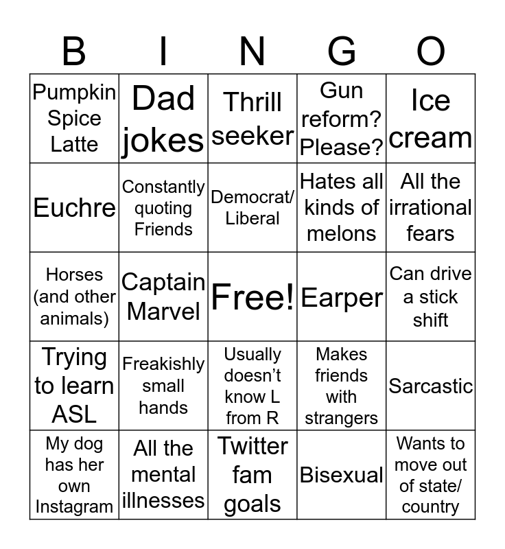 This bingo card has a free space and 24 words: Freakishly small hands, All the mental illnesses, Democrat/ Liberal, My dog has her own Instagram, Ice cream, Pumpkin Spice Latte, Euchre, Dad jokes, Earper, Usually doesn’t know L from R, Hates all kinds of melons, Horses (and other animals), Makes friends with strangers, Sarcastic, Constantly quoting Friends, Bisexual, Can drive a stick shift, Thrill seeker, All the irrational fears, Captain Marvel, Wants to move out of state/ country, Trying to learn ASL, Gun reform? Please? and Twitter fam goals.