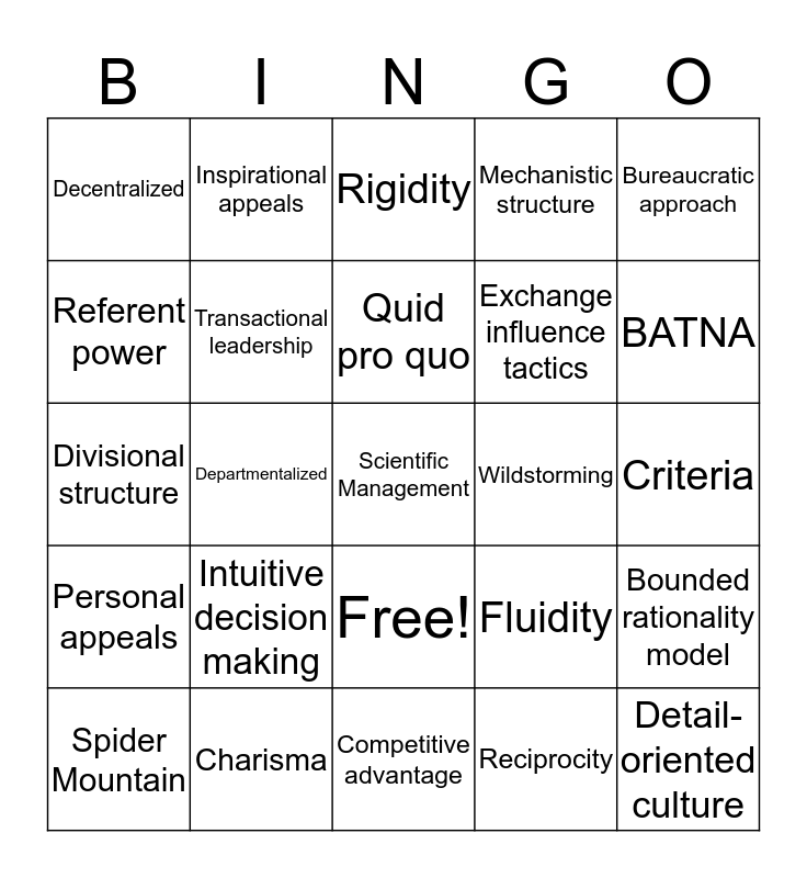 This bingo card has 26 words: Free!, Reciprocity, Quid pro quo, Charisma, Bureaucratic approach, Decentralized, Referent power, Inspirational appeals, Criteria, Fluidity, Exchange influence tactics, Divisional structure, Bounded rationality model, Spider Mountain, Departmentalized, Organic structure, Mechanistic structure, Personal appeals, Rigidity, Scientific Management, BATNA, Competitive advantage, Wildstorming, Intuitive decision making, Transactional leadership and Detail-oriented culture.