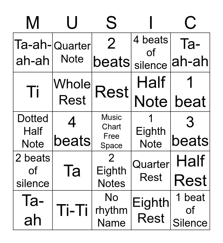 This bingo card has a free space and 24 words: Ta, Ti-Ti, Rest, Ta-ah, Ta-ah-ah, Ta-ah-ah-ah, Ti, Quarter Note, 1 Eighth Note, 2 Eighth Notes, Half Note, Dotted Half Note, Quarter Rest, Half Rest, Whole Rest, Eighth Rest, 3 beats, 2 beats, 1 beat, 4 beats, 1 beat of Silence, 2 beats of silence, 4 beats of silence and No rhythm Name.
