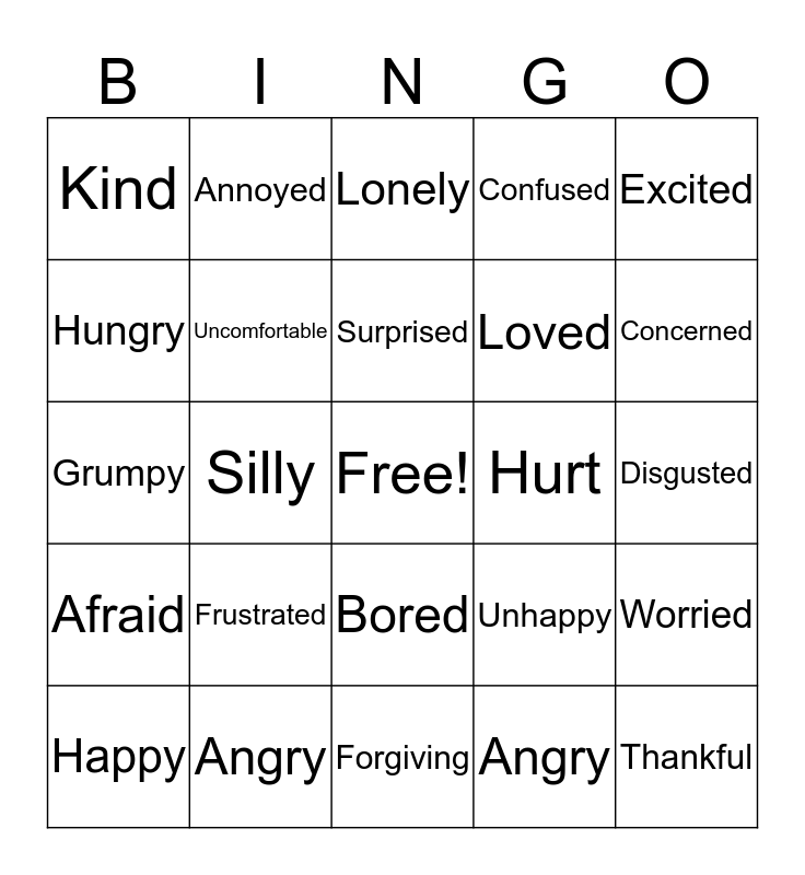 This bingo card has a free space and 24 words: Happy, Frustrated, Surprised, Angry, Excited, Kind, Annoyed, Lonely, Hurt, Disgusted, Grumpy, Uncomfortable, Unhappy, Worried, Hungry, Angry, Forgiving, Confused, Concerned, Afraid, Silly, Bored, Loved and Thankful.