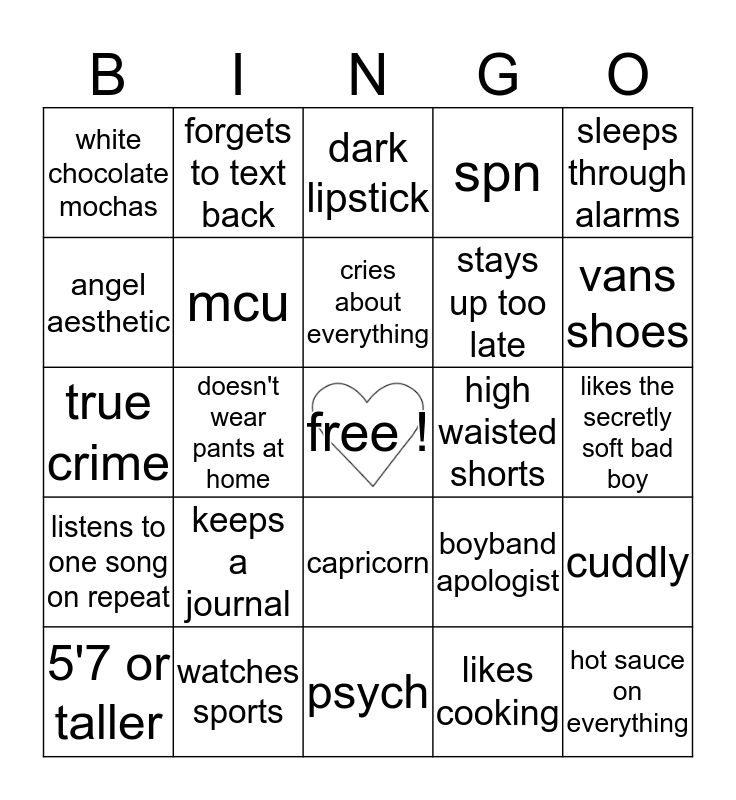 This bingo card has a free space and 24 words: keeps a journal, watches sports, cries about everything, 5'7 or taller, sleeps through alarms, white chocolate mochas, angel aesthetic, forgets to text back, high waisted shorts, capricorn, stays up too late, true crime, boyband apologist, cuddly, mcu, likes cooking, likes the secretly soft bad boy, dark lipstick, vans shoes, doesn't wear pants at home, hot sauce on everything, listens to one song on repeat, spn and psych.