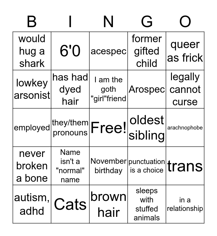 This bingo card has a free space and 24 words: Name isn't a "normal" name, Cats, I am the goth "girl"friend, autism, adhd, queer as frick, would hug a shark, lowkey arsonist, 6'0, oldest sibling, November birthday, Arospec, employed, punctuation is a choice, trans, has had dyed hair, sleeps with stuffed animals, arachnophobe, acespec, legally cannot curse, they/them pronouns, in a relationship, never broken a bone, former gifted child and brown hair.