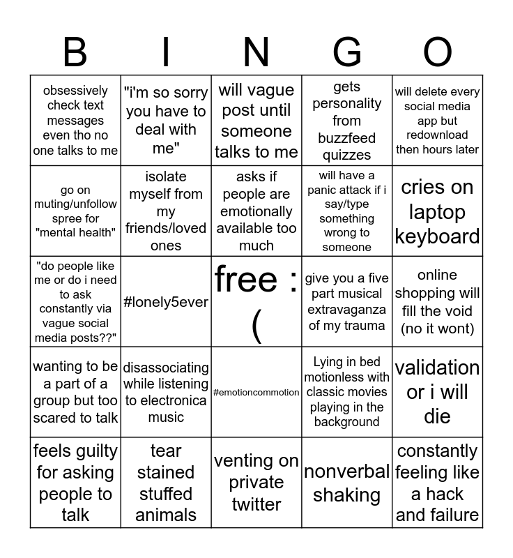 This bingo card has a free space and 24 words: disassociating while listening to electronica music, tear stained stuffed animals, asks if people are emotionally available too much, feels guilty for asking people to talk, will delete every social media app but redownload then hours later, obsessively check text messages even tho no one talks to me, go on muting/unfollow spree for "mental health", "i'm so sorry you have to deal with me", give you a five part musical extravaganza of my trauma, #emotioncommotion, will have a panic attack if i say/type something wrong to someone, "do people like me or do i need to ask constantly via vague social media posts??", Lying in bed motionless with classic movies playing in the background, validation or i will die, isolate myself from my friends/loved ones, nonverbal shaking, online shopping will fill the void (no it wont), will vague post until someone talks to me, cries on laptop keyboard, #lonely5ever, constantly feeling like a hack and failure, wanting to be a part of a group but too scared to talk, gets personality from buzzfeed quizzes and venting on private twitter.
