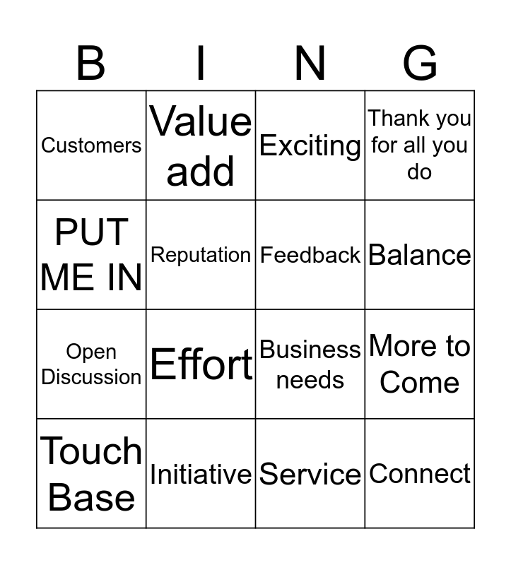 This bingo card has 16 words: Initiative, More to Come, Exciting, Customers, Open Discussion, Value add, Business needs, Service, PUT ME IN, Reputation, Touch Base, Thank you for all you do, Effort, Balance, Feedback and Connect.