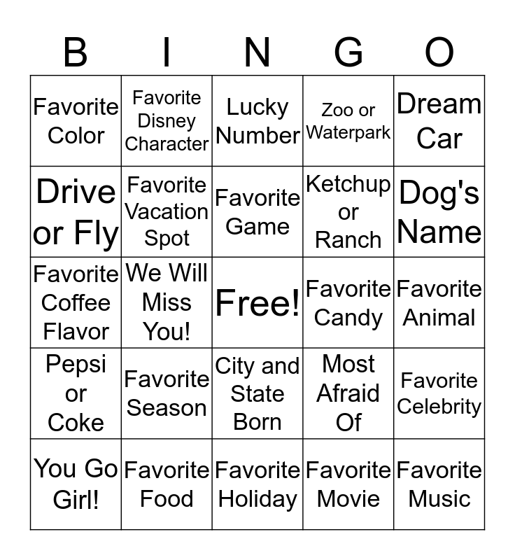 This bingo card has a free space and 29 words: You Go Girl!, Congrats!, We Will Miss You!, Always the Winner!, Favorite Color, Lucky Number, Favorite Vacation Spot, Favorite Season, Favorite Candy, Favorite Food, Favorite Animal, Favorite Music, Favorite Holiday, Favorite Movie, Dog's Name, Year Started with the State, City and State Born, Pepsi or Coke, Dream Car, Favorite Coffee Flavor, Most Afraid Of, Favorite Perfume, Ketchup or Ranch, Drive or Fly, Zoo or Waterpark, Favorite Disney Character, Favorite Celebrity, Favorite Game and How Many Tattoo's.