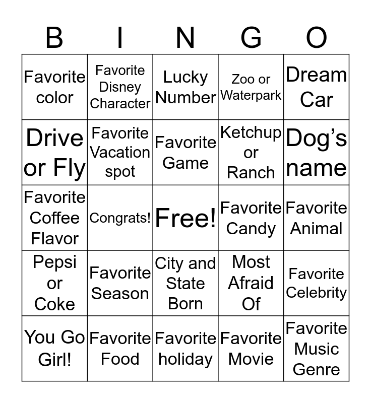 This bingo card has a free space and 29 words: You Go Girl!, Always the Winner!, Congrats!, We Will Miss You!, Favorite color, Lucky Number, Favorite Vacation spot, Favorite Season, Favorite Candy, Favorite Food, Favorite Animal, Favorite Music Genre, Favorite holiday, Favorite Movie, Dog’s name, Year started with the state, City and State Born, Pepsi or Coke, Dream Car, Favorite Coffee Flavor, Most Afraid Of, Favorite Perfume, Ketchup or Ranch, Drive or Fly, Zoo or Waterpark, Favorite Disney Character, Favorite Celebrity, Favorite Game and How many tattoo’s.