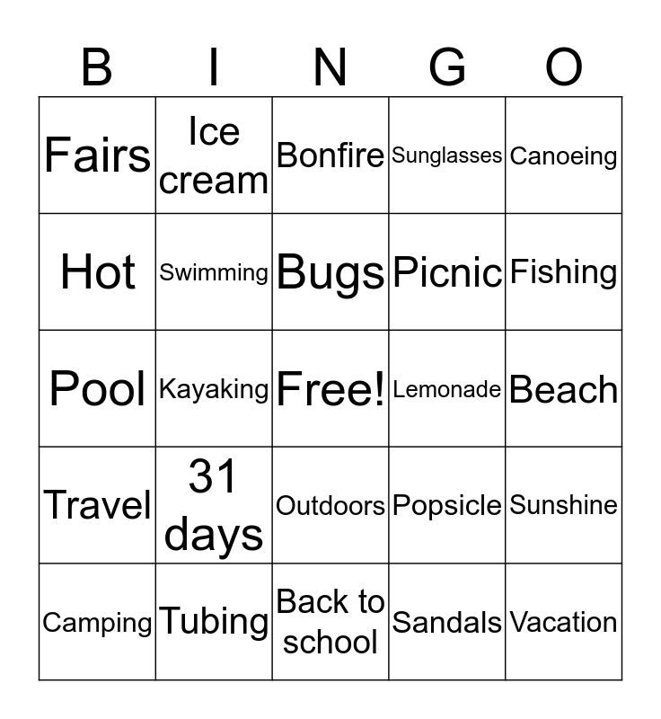 This bingo card has a free space and 25 words: 31 days, Back to school, Bugs, Camping, Canoeing, Fairs, Hot, Ice cream, Lemonade, Outdoors, Picnic, Pool, Popsicle, Sunshine, Swimming, Barbecue, Beach, Bonfire, Fishing, Kayaking, Vacation, Tubing, Travel, Sunglasses and Sandals.