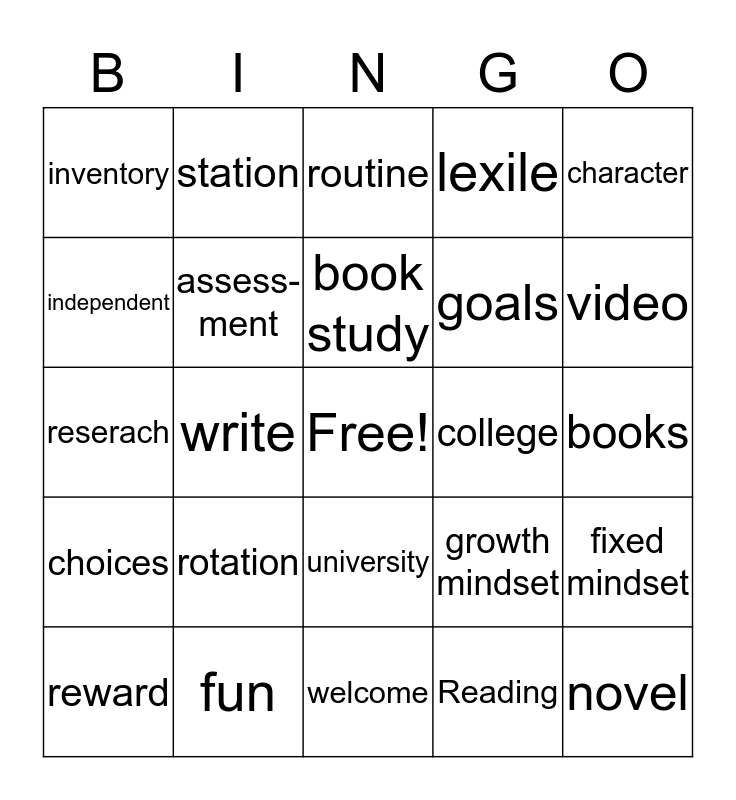 This bingo card has a free space and 24 words: rotation, fun, book study, reward, character, inventory, independent, station, college, university, goals, reserach, growth mindset, fixed mindset, assess- ment, Reading, books, routine, video, write, novel, choices, lexile and welcome.