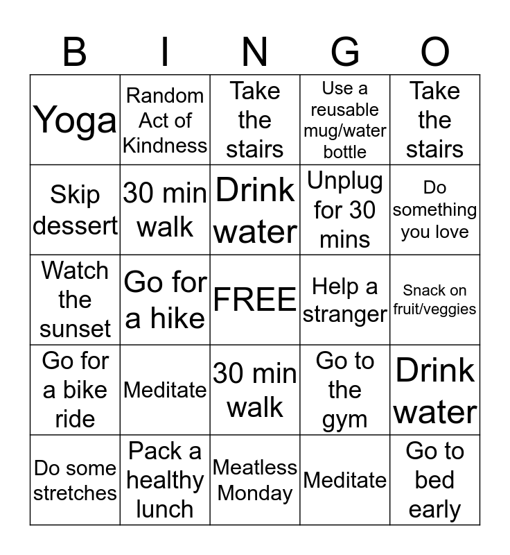 This bingo card has a free space and 24 words: Meditate, Pack a healthy lunch, Drink water, Do some stretches, Take the stairs, Yoga, Skip dessert, Random Act of Kindness, Help a stranger, 30 min walk, Unplug for 30 mins, Watch the sunset, Go to the gym, Drink water, 30 min walk, Meditate, Snack on fruit/veggies, Take the stairs, Do something you love, Go for a hike, Go to bed early, Go for a bike ride, Use a reusable mug/water bottle and Meatless Monday.