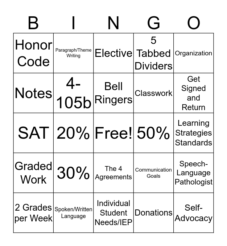 This bingo card has a free space and 24 words: 30%, Spoken/Written Language, Bell Ringers, 2 Grades per Week, Organization, Honor Code, Notes, Paragraph/Theme Writing, 50%, The 4 Agreements, Classwork, SAT, Communication Goals, Speech-Language Pathologist, 4-105b, Donations, Learning Strategies Standards, Elective, Get Signed and Return, 20%, Self-Advocacy, Graded Work, 5 Tabbed Dividers and Individual Student Needs/IEP.