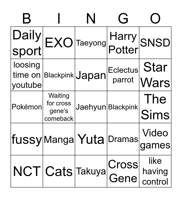 This bingo card has a free space and 24 words: NCT, Manga, Japan, Cross Gene, SNSD, Daily sport, EXO, Taeyong, Blackpink, The Sims, Pokémon, Blackpink, Dramas, Video games, loosing time on youtube, Cats, Takuya, Harry Potter, Star Wars, fussy, Waiting for cross gene’s comeback, Yuta, Eclectus parrot and like having control.