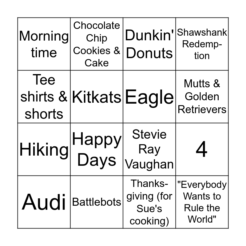 This bingo card has 28 words: Orange, Biking, Hiking, Photography, Kitkats, Dunkin' Donuts, Chocolate Chip Cookies & Cake, "Everybody Wants to Rule the World", Battlebots, Filet Mignon & Pizza, Stevie Ray Vaughan, Shawshank Redemp-tion, The Office, Dire Straits, Happy Days, Breyer's Vanilla Ice Cream, Scrambled Eggs & French Toast, Eagle, Mutts & Golden Retrievers, Golf, Morning time, Fall, Audi, 4, Thanks- giving (for Sue's cooking), Marco Island, Tee shirts & shorts and Walking in the woods.