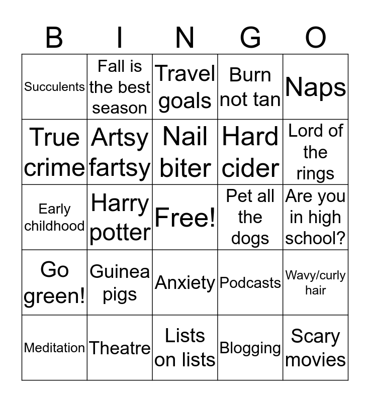 This bingo card has a free space and 24 words: Guinea pigs, Theatre, Nail biter, Meditation, Naps, Succulents, True crime, Fall is the best season, Pet all the dogs, Anxiety, Hard cider, Early childhood, Podcasts, Wavy/curly hair, Artsy fartsy, Blogging, Are you in high school?, Travel goals, Lord of the rings, Harry potter, Scary movies, Go green!, Burn not tan and Lists on lists.
