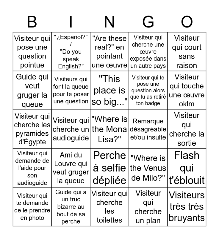 This bingo card has a free space and 24 words: Ami du Louvre qui veut gruger la queue, Guide qui a un truc bizarre au bout de sa perche, "This place is so big...", Visiteur qui te demande de le prendre en photo, Visiteur qui court sans raison, Visiteur qui pose une question pointue, Guide qui veut gruger la queue, "¿Español?" / "Do you speak English?", Remarque désagréable et/ou insulte, Perche à selfie dépliée, Visiteur qui te pose une question alors que tu as retiré ton badge, Visiteur qui cherche les pyramides d'Égypte, "Where is the Venus de Milo?", Flash qui t'éblouit, Visiteurs qui font la queue pour te poser une question, Visiteur qui cherche un plan, Visiteur qui cherche la sortie, "Are these real?" en pointant une œuvre, Visiteur qui touche une œuvre oklm, Visiteur qui cherche un audioguide, Visiteurs très très bruyants, Visiteur qui demande de l'aide pour son audioguide, Visiteur qui cherche une œuvre exposée dans un autre pays and Visiteur qui cherche les toilettes.