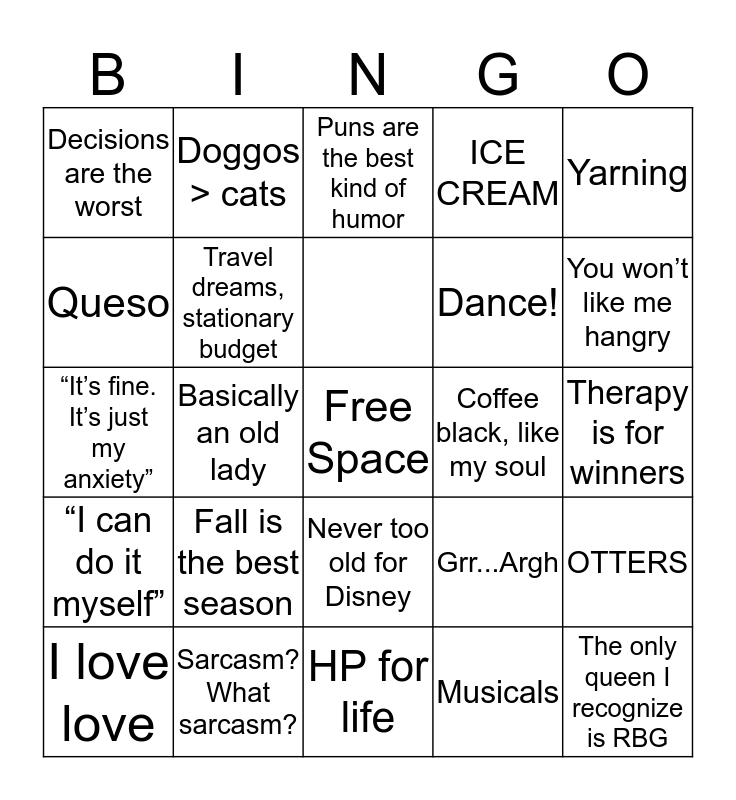 This bingo card has a free space and 23 words: Fall is the best season, Sarcasm? What sarcasm?, I love love, Yarning, Decisions are the worst, Queso, Doggos > cats, Coffee black, like my soul, Never too old for Disney, Dance!, “It’s fine. It’s just my anxiety”, Grr...Argh, OTTERS, Travel dreams, stationary budget, Musicals, Therapy is for winners, Puns are the best kind of humor, You won’t like me hangry, Basically an old lady, The only queen I recognize is RBG, “I can do it myself”, ICE CREAM and HP for life.