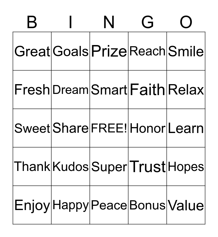 This bingo card has a free space and 24 words: Kudos, Happy, Smart, Enjoy, Smile, Great, Fresh, Goals, Honor, Super, Faith, Sweet, Trust, Hopes, Dream, Bonus, Learn, Prize, Relax, Share, Value, Thank, Reach and Peace.