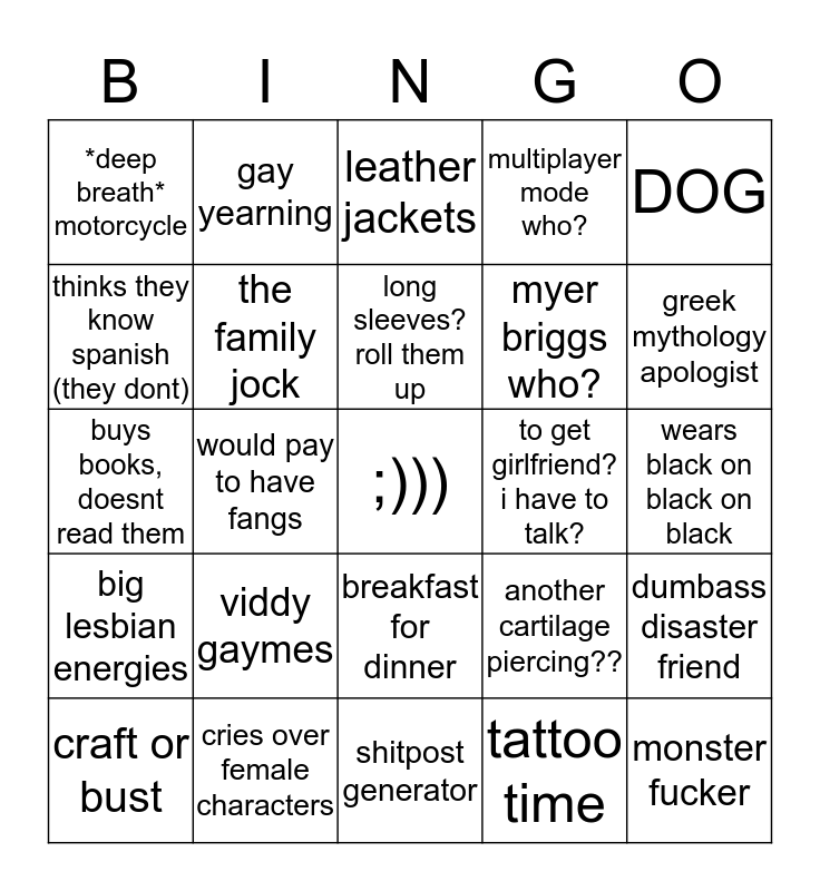 This bingo card has a free space and 24 words: viddy gaymes, cries over female characters, long sleeves? roll them up, craft or bust, DOG, *deep breath* motorcycle, thinks they know spanish (they dont), gay yearning, to get girlfriend? i have to talk?, breakfast for dinner, myer briggs who?, buys books, doesnt read them, another cartilage piercing??, dumbass disaster friend, the family jock, tattoo time, wears black on black on black, leather jackets, greek mythology apologist, would pay to have fangs, monster fucker, big lesbian energies, multiplayer mode who? and shitpost generator.