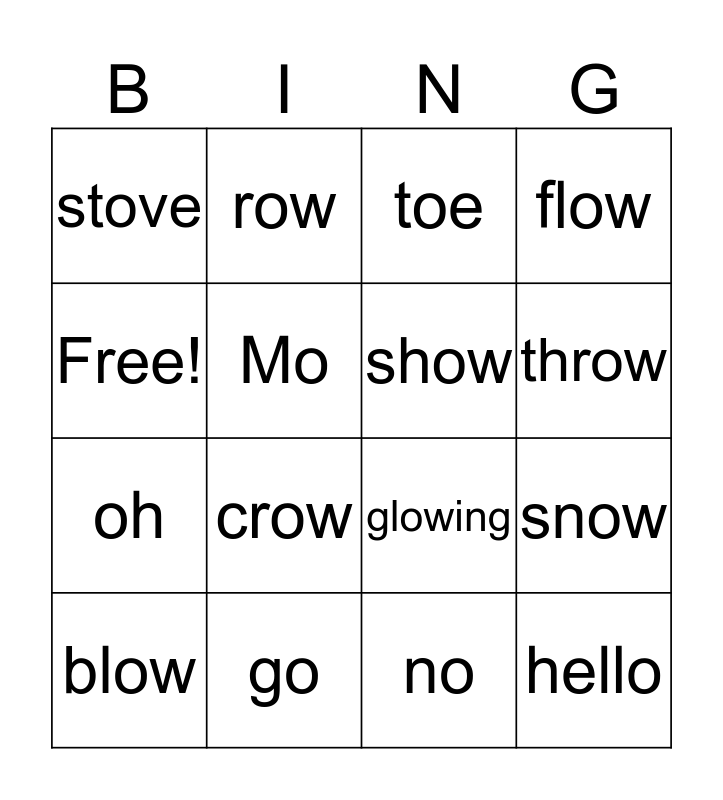 This bingo card has 16 words: go, snow, toe, stove, oh, row, glowing, no, Free!, Mo, blow, flow, crow, throw, show and hello.