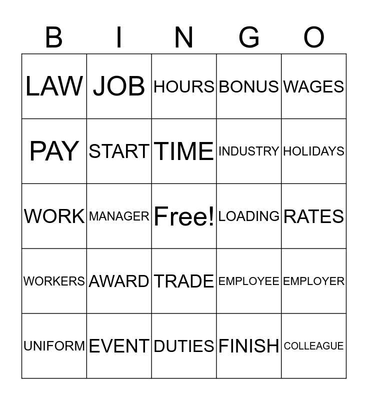 This bingo card has a free space and 24 words: AWARD, EVENT, TIME, UNIFORM, WAGES, LAW, PAY, JOB, LOADING, TRADE, INDUSTRY, WORK, EMPLOYEE, EMPLOYER, START, FINISH, RATES, HOURS, HOLIDAYS, MANAGER, COLLEAGUE, WORKERS, BONUS and DUTIES.