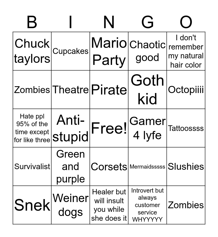 This bingo card has a free space and 24 words: Green and purple, Weiner dogs, Pirate, Snek, I don't remember my natural hair color, Chuck taylors, Zombies, Cupcakes, Gamer 4 lyfe, Corsets, Goth kid, Hate ppl 95% of the time except for like three, Mermaidsssss, Slushies, Theatre, Introvert but always customer service WHYYYYY, Tattoossss, Mario Party, Octopiiii, Anti-stupid, Zombies, Survivalist, Chaotic good and Healer but will insult you while she does it.