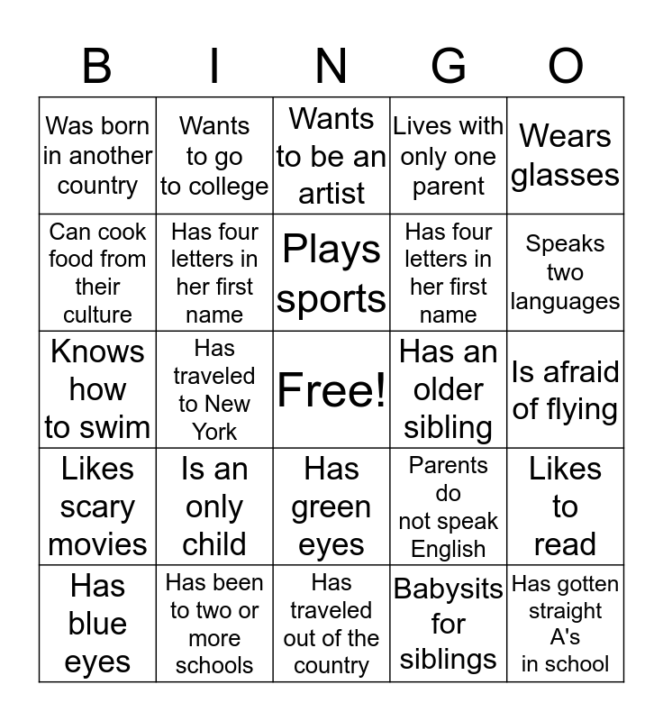 This bingo card has a free space and 24 words: Has blue eyes, Is an only child, Plays sports, Babysits for siblings, Wears glasses, Was born in another country, Wants to go to college, Wants to be an artist, Has an older sibling, Is afraid of flying, Knows how to swim, Has four letters in her first name, Parents do not speak English, Likes to read, Can cook food from their culture, Has been to two or more schools, Has traveled out of the country, Lives with only one parent, Speaks two languages, Likes scary movies, Has traveled to New York, Has green eyes, Has four letters in her first name and Has gotten straight A's in school.