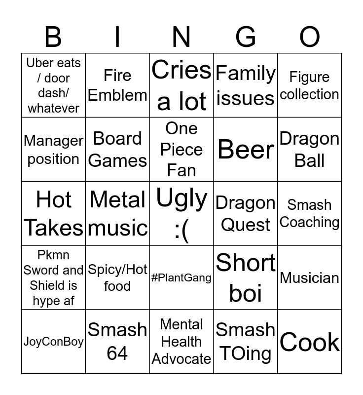 This bingo card has a free space and 24 words: Spicy/Hot food, Smash 64, One Piece Fan, JoyConBoy, Figure collection, Uber eats / door dash/ whatever, Manager position, Fire Emblem, Dragon Quest, #PlantGang, Beer, Hot Takes, Short boi, Musician, Board Games, Smash TOing, Smash Coaching, Cries a lot, Dragon Ball, Metal music, Cook, Pkmn Sword and Shield is hype af, Family issues and Mental Health Advocate.