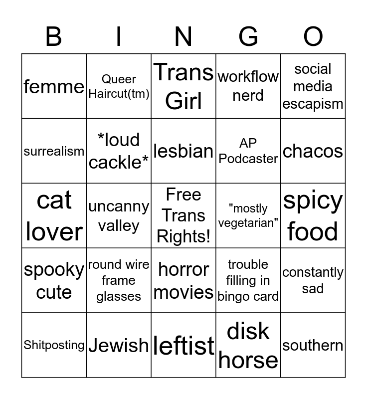 This bingo card has a free space and 24 words: round wire frame glasses, Jewish, lesbian, Shitposting, social media escapism, femme, surrealism, Queer Haircut(tm), "mostly vegetarian", horror movies, AP Podcaster, cat lover, trouble filling in bingo card, constantly sad, *loud cackle*, disk horse, spicy food, Trans Girl, chacos, uncanny valley, southern, spooky cute, workflow nerd and leftist.