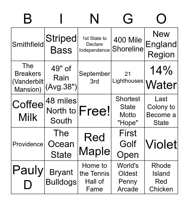 This bingo card has a free space and 31 words: Home to the Tennis Hall of Fame, Smallest State, 48 miles North to South, January ~ L: 21˚ H: 37˚, Smithfield, 1st State to Declare Independence, 49" of Rain (Avg.38"), First Golf Open, Shortest State Motto "Hope", World's Oldest Penny Arcade, Last Colony to Become a State, Rhode Island Red Chicken, 36" of Snow (Avg. 28"), 221 Rhode Islands fit into Texas, 14% Water, 37 miles East to West, Violet, The Ocean State, Providence, Red Maple, New England Region, First to Sink a British Ship, Pauly D, Striped Bass, 21 Lighthouses, The Breakers (Vanderbilt Mansion), 400 Mile Shoreline, Coffee Milk, Bryant Bulldogs, September 3rd and August 22nd.