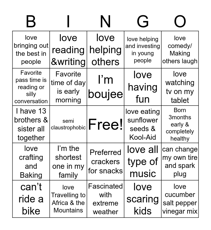 This bingo card has a free space and 25 words: love crafting and Baking, love Travelling to Africa & the Mountains, Fascinated with extreme weather, love scaring kids, love comedy/ Making others laugh, love bringing out the best in people, love reading &writing, love helping others, love eating sunflower seeds & Kool-Aid, can change my own tire and spark plug, Favorite pass time is reading or silly conversation, Favorite time of day is early morning, love singing, love all type of music, love watching tv on my tablet, can’t ride a bike, semi claustrophobic, I’m boujee, love having fun, Born 3months early & completely healthy, I have 13 brothers & sister all together, I’m the shortest one in my family, Preferred crackers for snacks, love helping and investing in young people and love cucumber salt pepper vinegar mix.