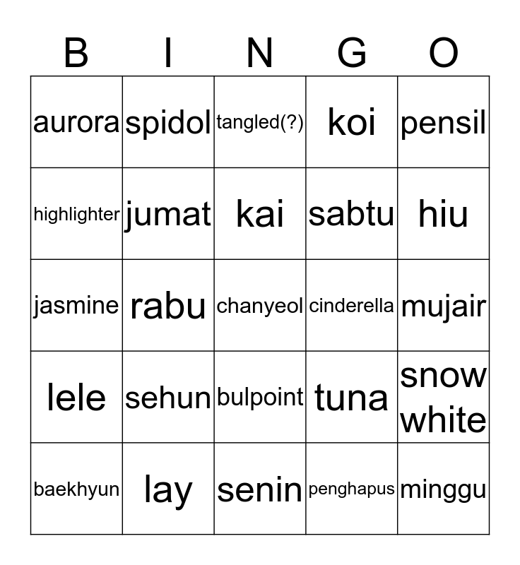This bingo card has a free space and 24 words: sehun, lay, kai, baekhyun, pensil, aurora, highlighter, spidol, cinderella, bulpoint, sabtu, jasmine, tuna, snow white, jumat, penghapus, mujair, tangled(?), hiu, rabu, minggu, lele, koi and senin.