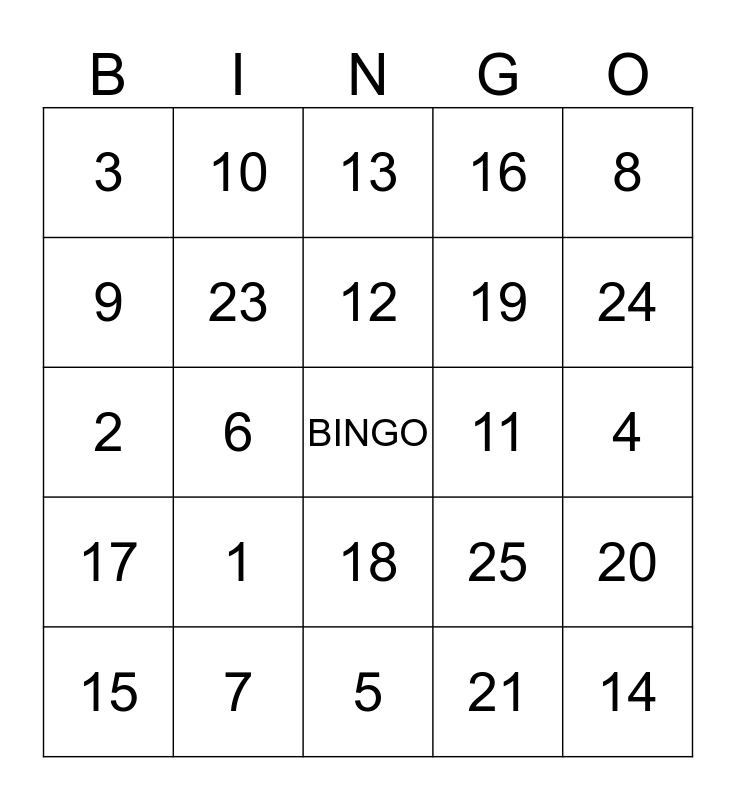 This bingo card has a free space and 24 words: 1, 7, 12, 15, 8, 3, 9, 10, 11, 18, 19, 2, 25, 20, 23, 21, 4, 13, 24, 6, 14, 17, 16 and 5.