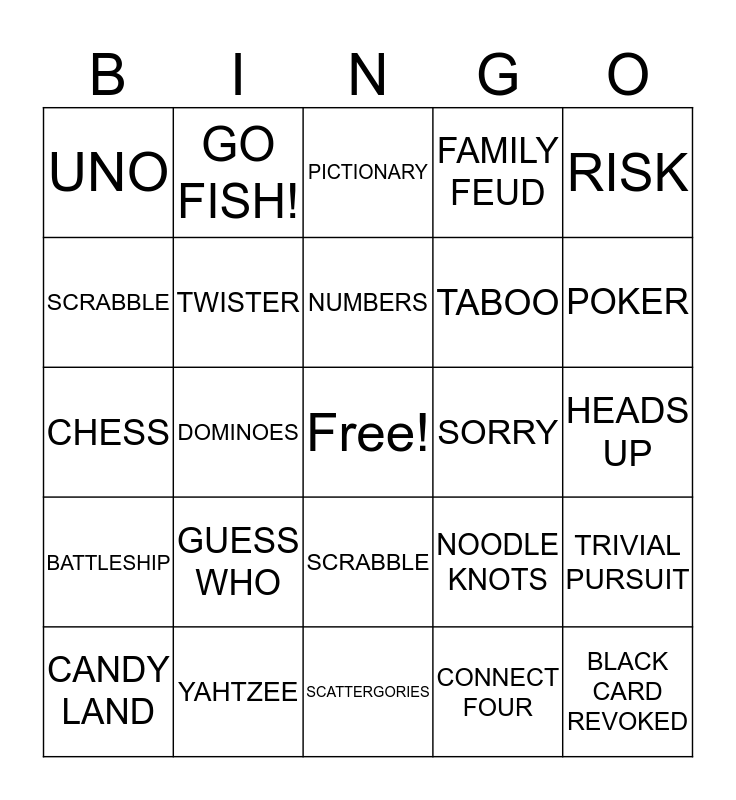 This bingo card has a free space and 35 words: APPLES TO APPLES, MONOPOLY, LIFE, TABOO, BLACK CARD REVOKED, UNO, TWISTER, MANCALA, SORRY, CHECKERS, CHESS, GO FISH!, SCRABBLE, CLUE, RISK, BATTLESHIP, YAHTZEE, PICTIONARY, CONNECT FOUR, HEADS UP, CANDY LAND, DOMINOES, SCATTERGORIES, BLACK JACK, POKER, SCRABBLE, PHASE 10, JENGA, NOODLE KNOTS, TRIVIAL PURSUIT, CARDS AGAINST HUMANITY, GUESS WHO, NUMBERS, FAMILY FEUD and SCRAWL.