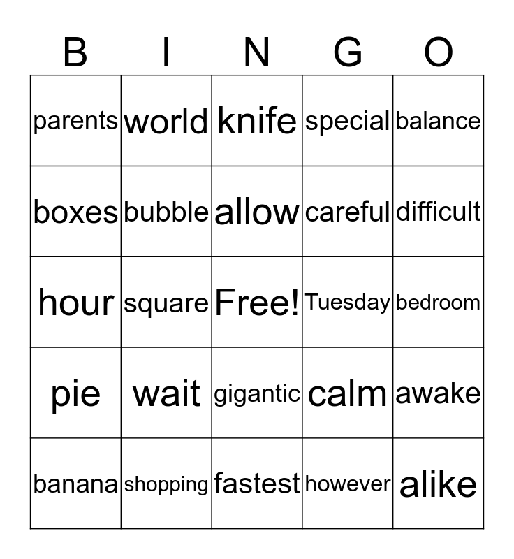 This bingo card has a free space and 49 words: afternoon, alike, buy, fastest, wait, while, world, believe, boxes, breakfast, bubble, special, awake, calm, twelve, twenty, allow, Tuesday, Saturday, balance, square, however, parents, careful, cushion, difficult, banana, fault, gigantic, pie, replied, getting, happened, hello, shopping, awful, behind, trouble, bedroom, ache, build, Wednesday, Sunday, finished, hour, knife, camera, picked and hospital.