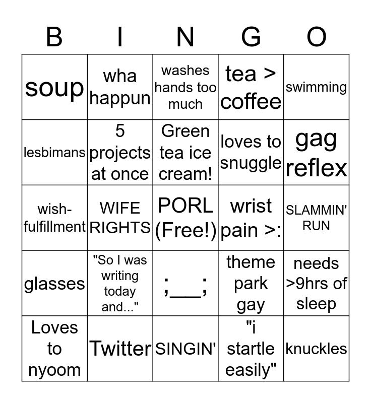 This bingo card has a free space and 24 words: "So I was writing today and...", Twitter, Green tea ice cream!, Loves to nyoom, swimming, soup, lesbimans, wha happun, wrist pain >:, ;__;, loves to snuggle, wish-fulfillment, theme park gay, needs >9hrs of sleep, 5 projects at once, "i startle easily", SLAMMIN' RUN, washes hands too much, gag reflex, WIFE RIGHTS, knuckles, glasses, tea > coffee and SINGIN'.