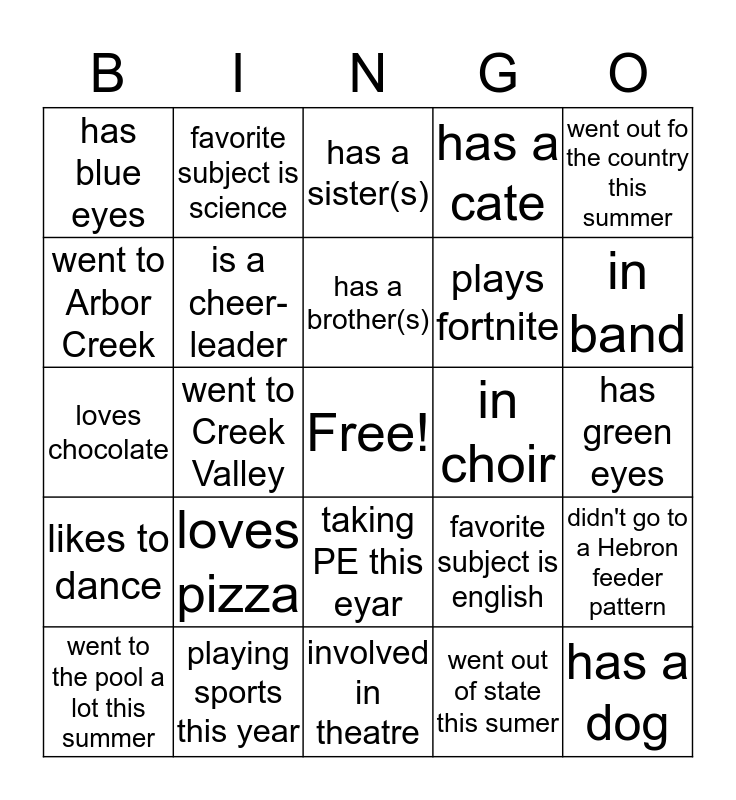 This bingo card has a free space and 34 words: likes to sing, went out of state this sumer, thinks summer was too short, also in English this semester, likes to dance, is a cheer- leader, went out fo the country this summer, went to the pool a lot this summer, favorite subject is science, favorite subject is history, has a brother(s), has a sister(s), only child, favorite color is purple, in choir, in band, playing sports this year, loves chocolate, loves pizza, favorite subject is english, taking PE this eyar, stayed at home this summer, has blue eyes, has green eyes, involved in theatre, has a dog, has a cate, no pets, plays fortnite, went to Arbor Creek, went to Killian, went to Creek Valley, didn't go to a Hebron feeder pattern and favorite subject is Math.